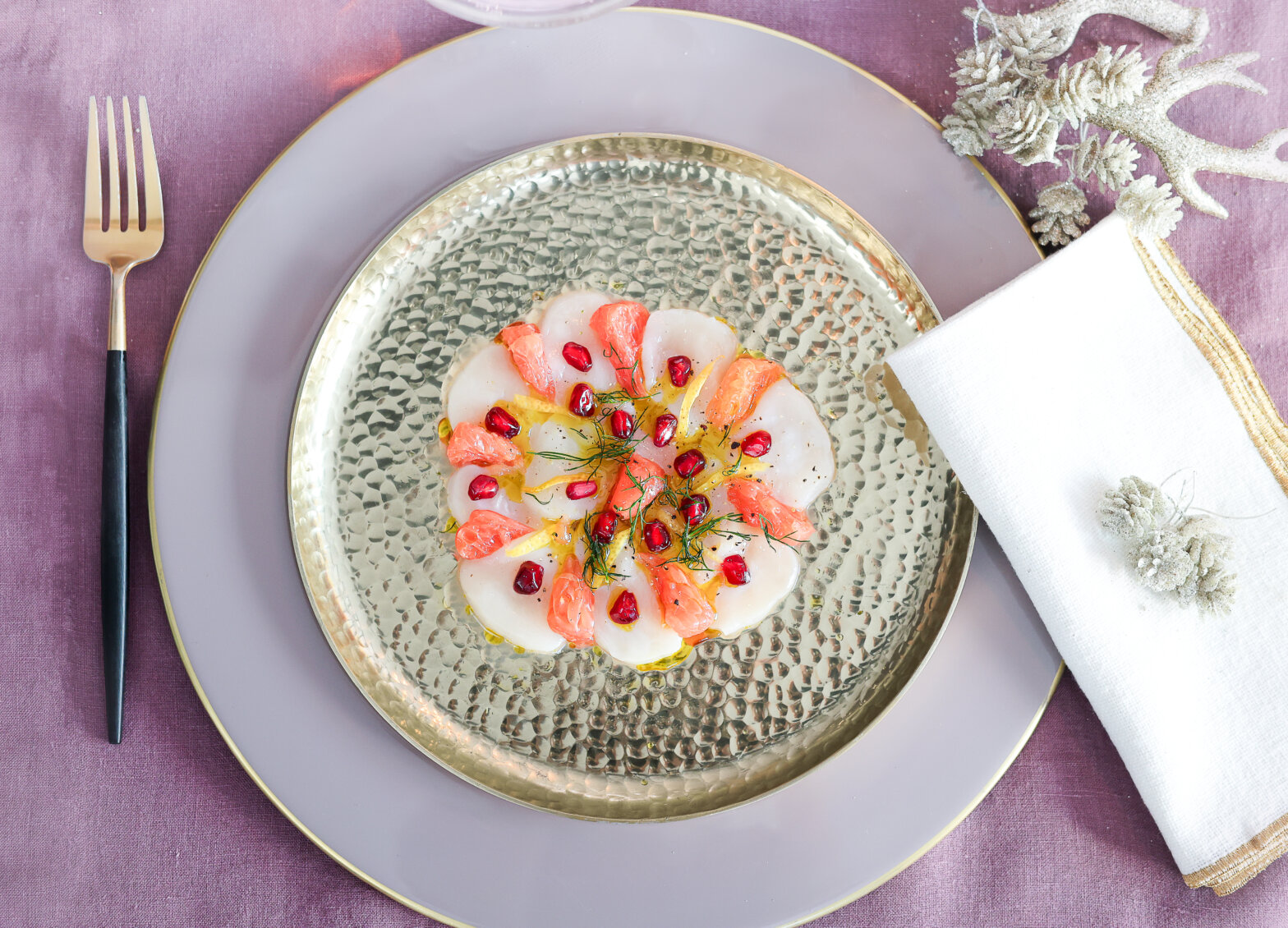 Carpaccio de Saint-Jacques nacrées, pamplemousse rose et grains de grenade