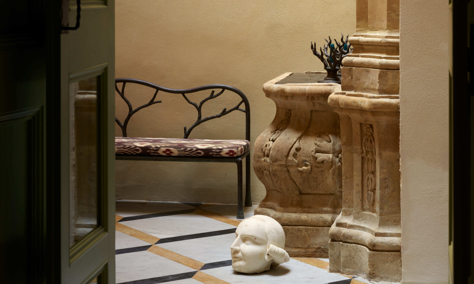 Baroque et contemporain Dans l’entrée, autour du puits ancien, l’architecte d’intérieur a redessiné le sol et conçu la banquette. La tête en marbre a été chinée. Clin d’œil au chevalier qui habitait les lieux au XVIe siècle. © Rachel Smith
